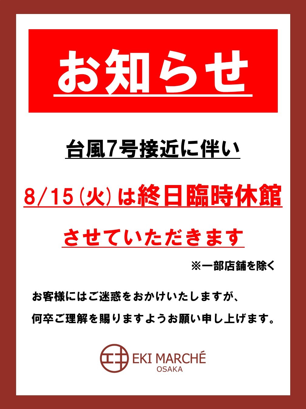 Anuncio de cierre temporal de todo el día causado por el tifón núm. 7 (8/15)