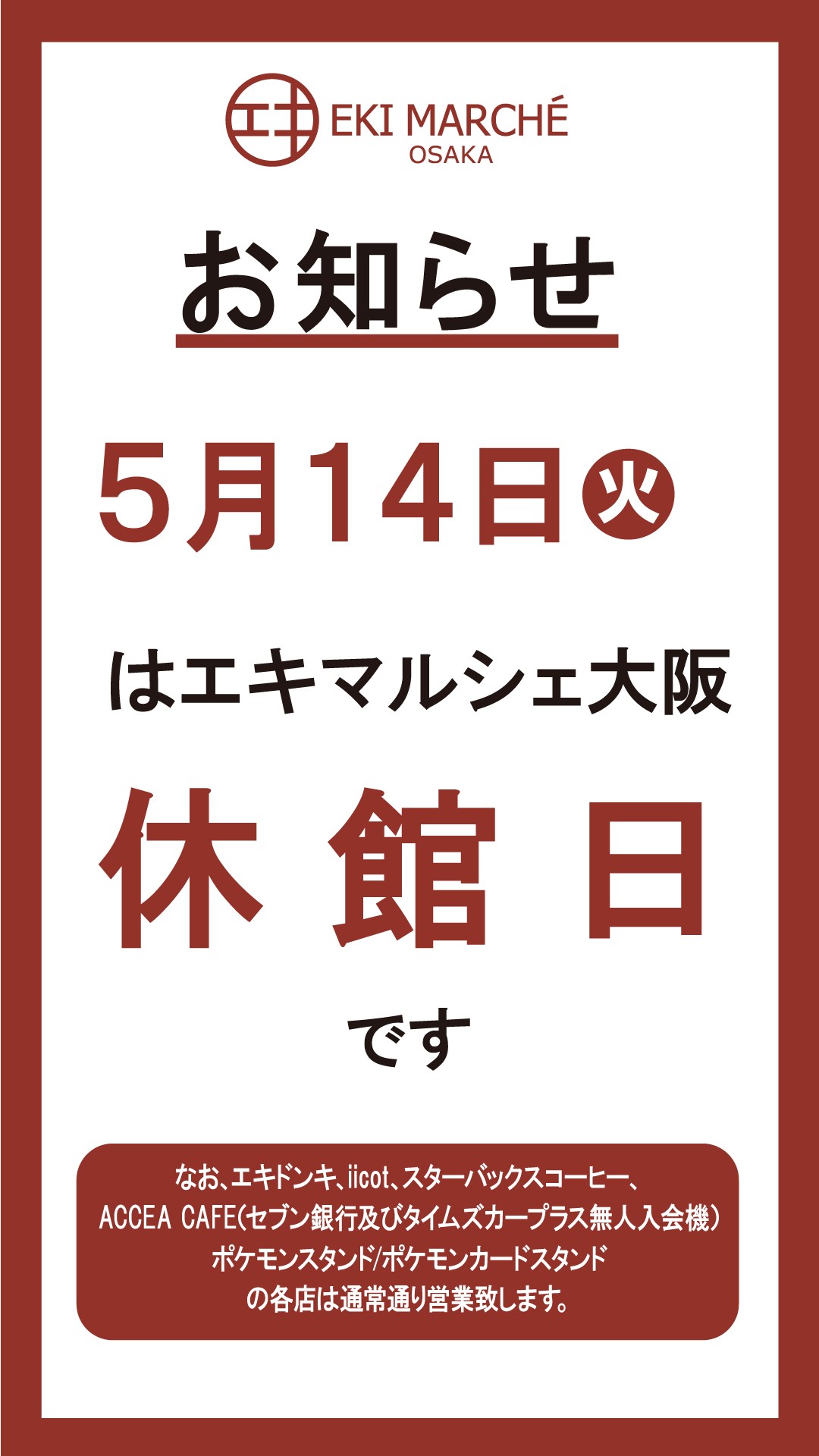El martes, 14 de mayo de 2024, el eki marche Osaka es un día cerrado.