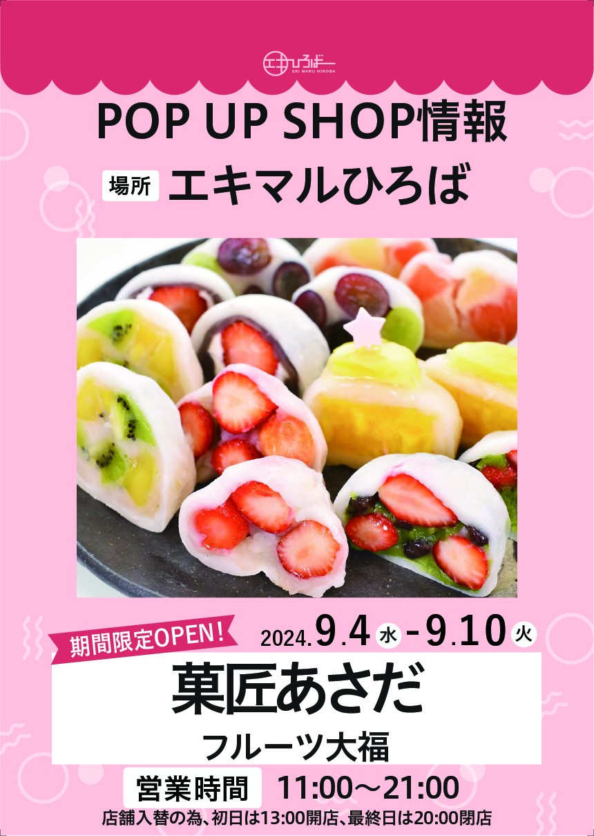¡«el 菓匠 あさだ» está ABIERTO en el Event space sólo en períodos del 4 de septiembre al 10 de septiembre!