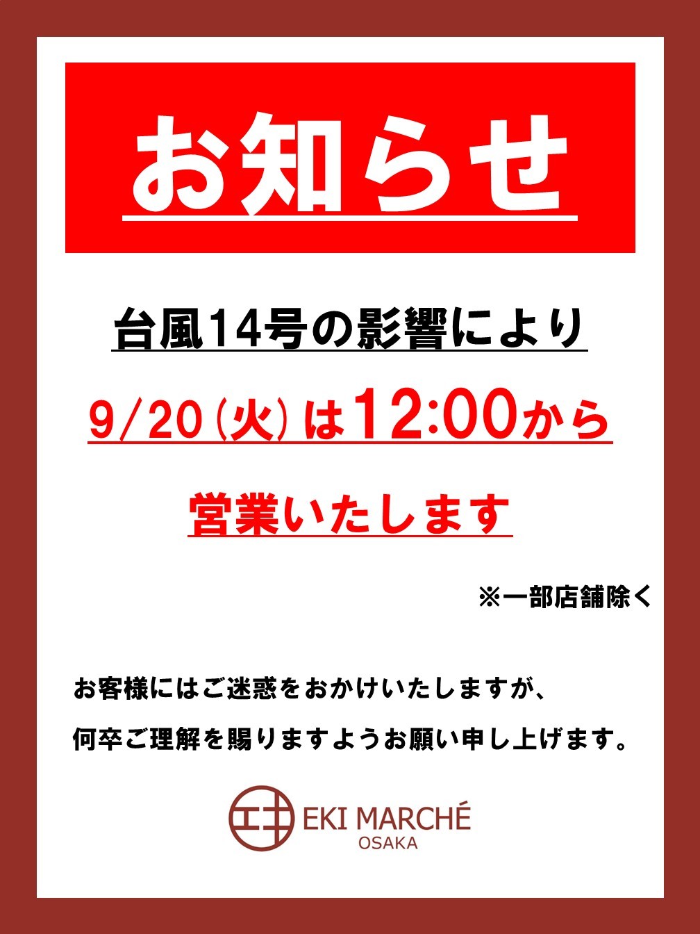 Anuncio de cambio de horas de oficina causado por el tifón núm. 14 (9/20)