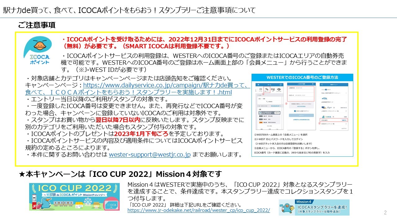※El registro de uso del servicio del punto de ICOCA es posible con el registro del número ICOCA a WESTER o la máquina del billete automática del área ICOCA. Puedo realizar el registro del número ICOCA a WESTER de «un menú del miembro» de la pantalla de casa superior. (※ J-WEST ID es necesario)