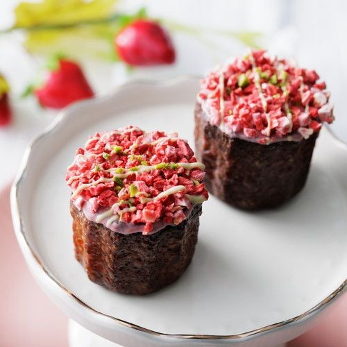 En cannele de Bordeaux del gusto de fresa que usó el chocolate de fresa en abundancia, decoré el chocolate de fresa. Además, el aspecto que una cubierta buena hizo una fresa seca y el pistacho que aplasté es cannele de Bordeaux bonito.