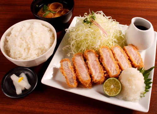 Un juego limitado con la comida en el verano cuando puse un rábano rallado y el vinagre ponzu que son fríos a la chuleta del lomo que puede disfrutar a fondo del dulzor de la grasa peculiar a un cerdo de belleza del té y gusto de la carne juntos. Es el comestible sin cualquier pena claramente durante el día de verano caliente y húmedo. ¡En la hora de verano cuando el apetito se cae, comemos bien, y vamos a adquirir la fuerza física!
